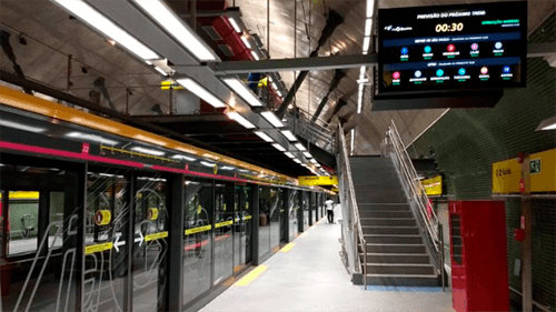 • Sinalização clara e moderna, com mapas da linha, indicação de plataformas e informações de serviço.