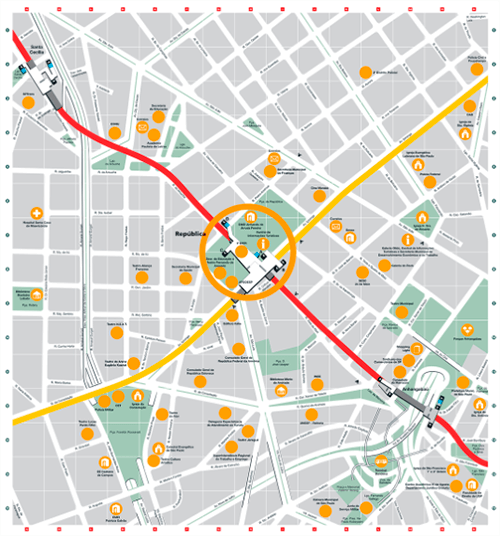 ⇒ Acessos múltiplos: diversas entradas e saídas distribuídas pela Praça da República e vias do entorno, facilitando o acesso a diferentes pontos do centro.
